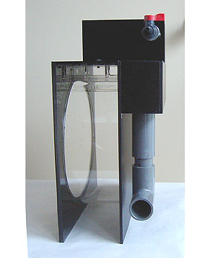 水槽部と置水槽から成っており、水の流れは、ホースで置水槽に循環海水を給水し、円筒型水槽に自然流下し、隔壁メッシュから背面の排水受けに流れ、排水口よりオーバーフローして排水されます。